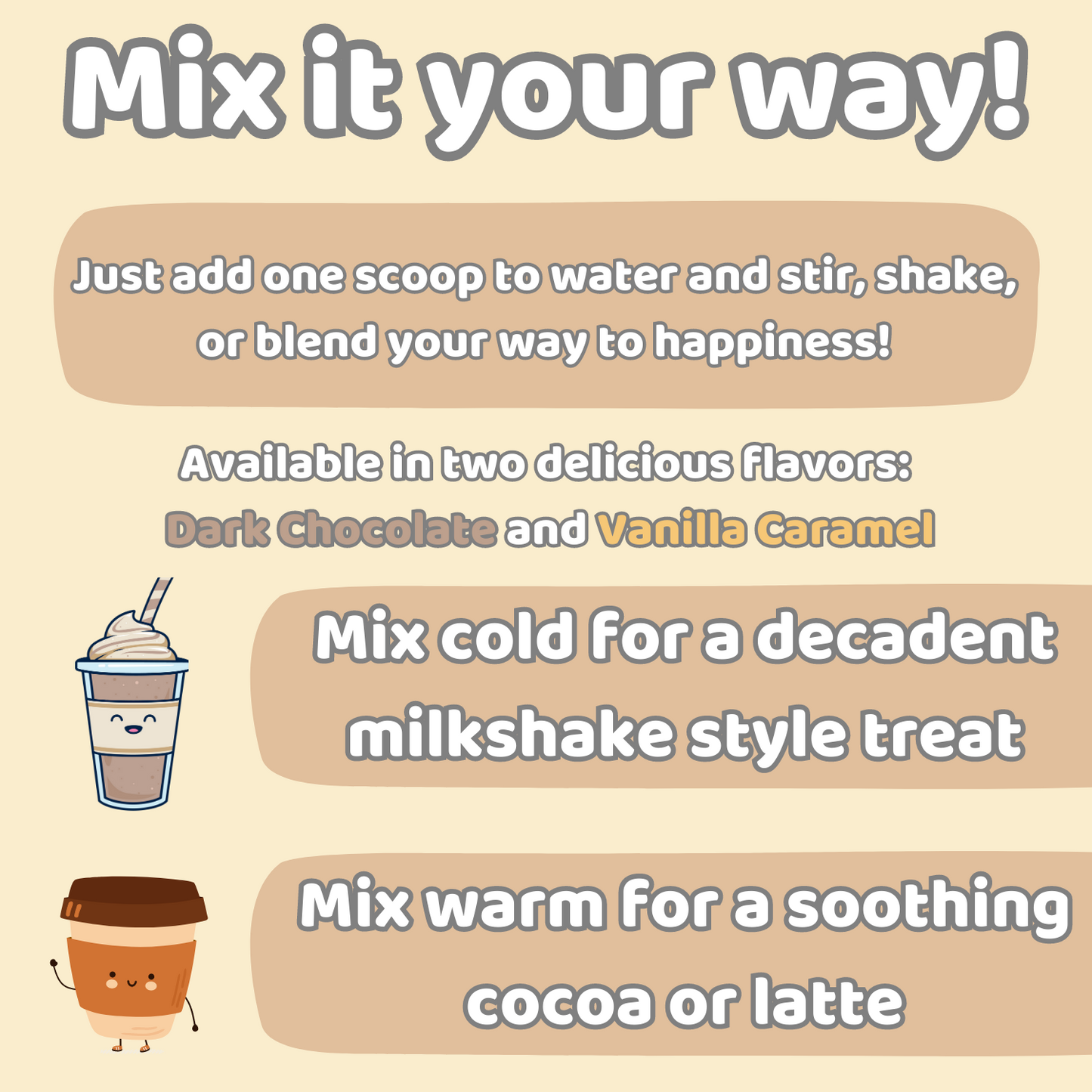 Whether you're a fitness enthusiast looking for a post-workout treat, or just someone looking for a convenient on-the-go protein boost, our Vanilla Caramel and Dark Chocolate mixes are the perfect choice.